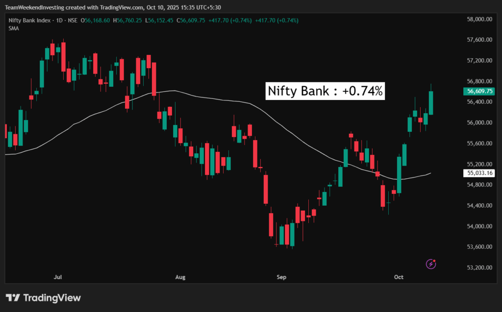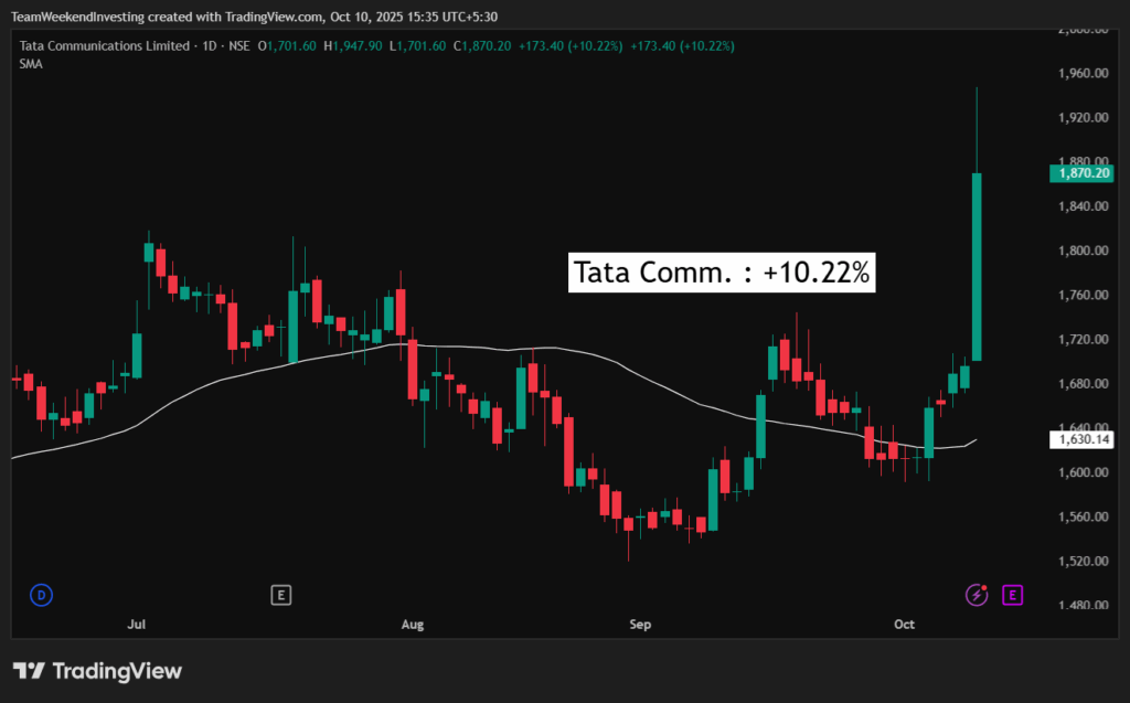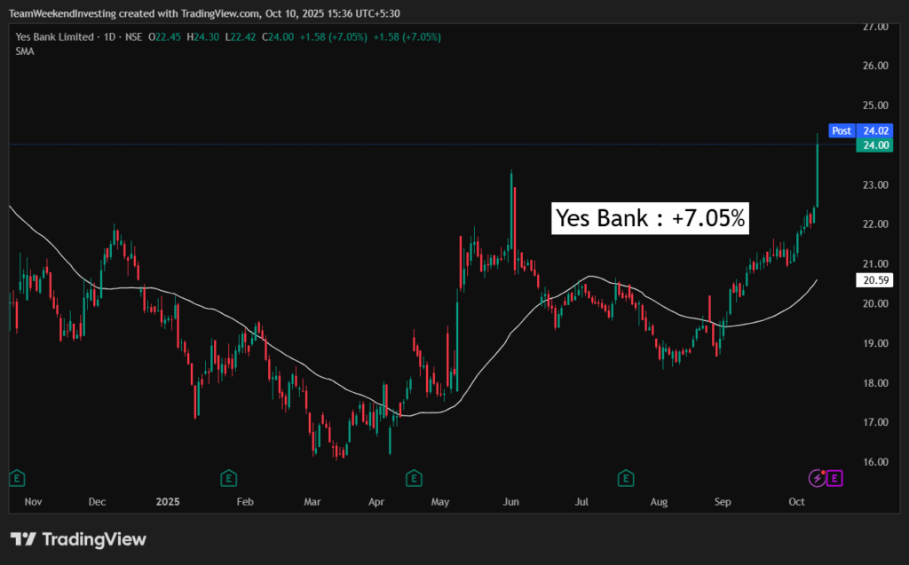 The biggest mover of the day was Tata Communications, which surged over 10% after Tata Capital’s listing and ahead of its own results. Yes Bank also rallied sharply from ₹18–20 recently to ₹24, with talks about a possible stake sale by SBI fueling the move.