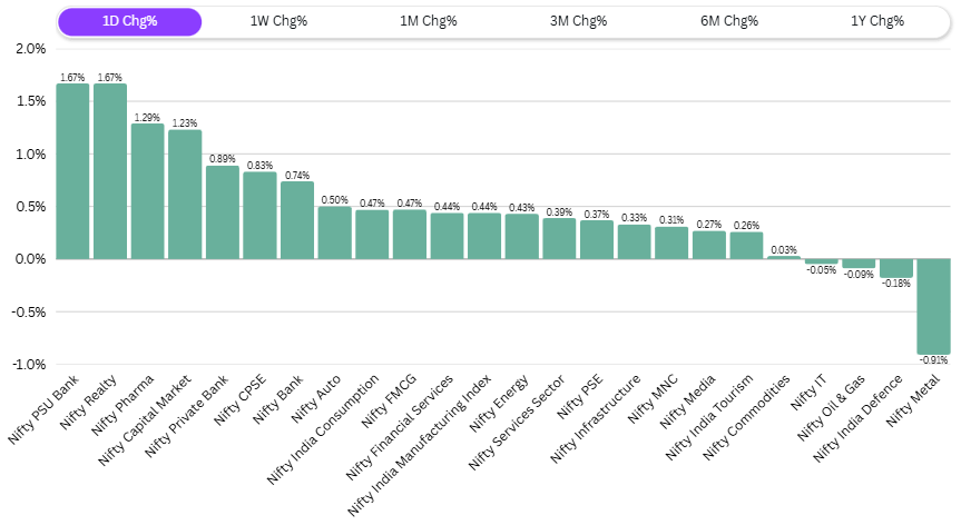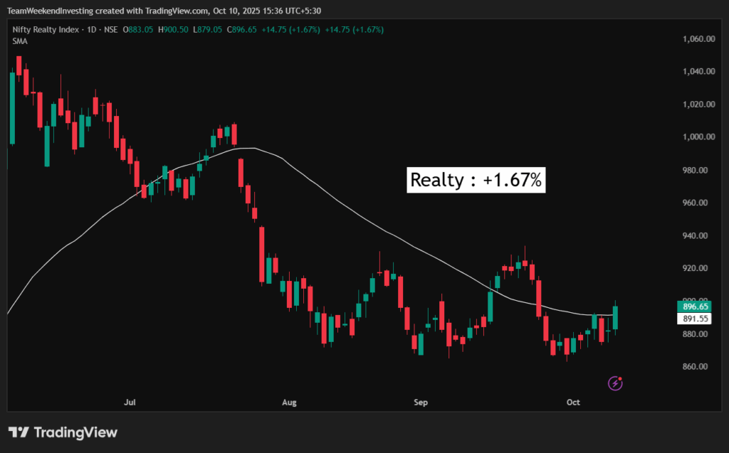 Among sectors, PSU banks, real estate, pharma, and capital markets were the strongest. There’s a growing belief that weekly expiries are here to stay, and the market’s narrative keeps swinging with every development. Real Estate stocks like Godrej, Signature, Brigade, Prestige, and Lodha are trading above averages, signaling strength.