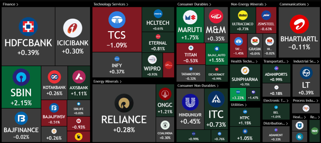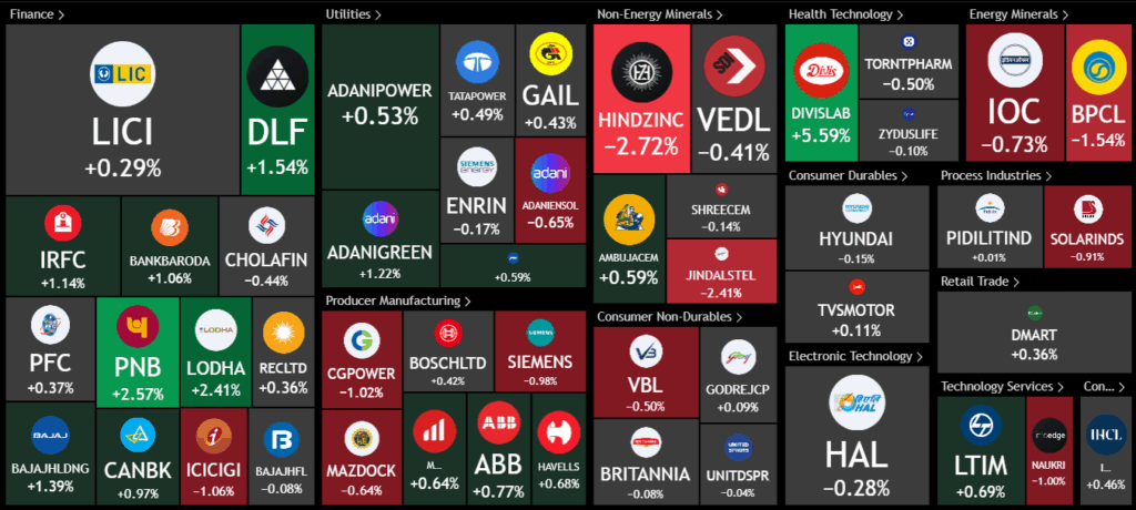 Top performers in the Nifty were SBI, Maruti, Bajaj Auto, and Cipla. In the next Nifty group, we saw gains in Real Estate and pharma stocks — Lodha, DLF, Divi’s Lab, and PNB were some of the strong movers. Metals, which had risen yesterday, saw mild profit booking today, with Jindal Steel and Hindustan Zinc among those cooling off.