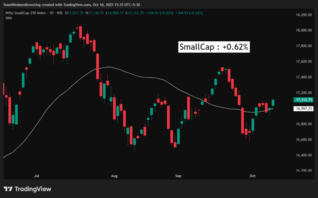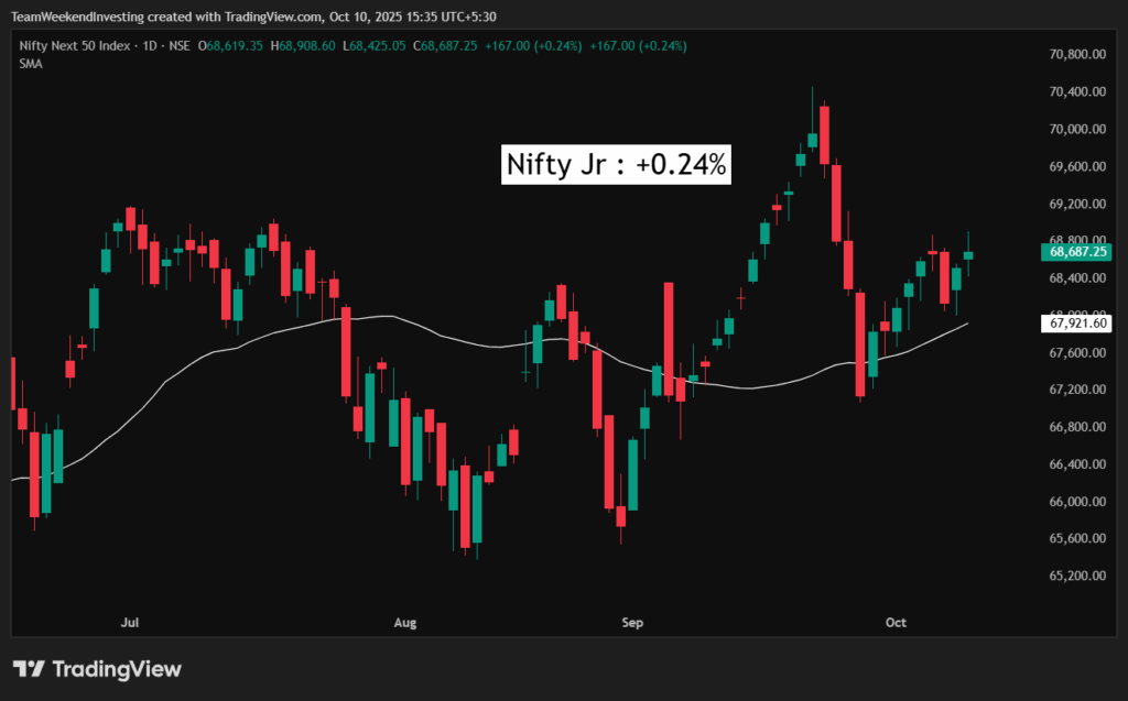 If the market crosses its current pivot point, we could see a burst of energy and optimism return. Today’s numbers show Nifty up by 0.41%, Nifty Junior by 0.24%, and midcaps doing well with a 0.41% rise. Small caps also moved up 0.62% after being stuck for five days, marking their highest level in over a week.
