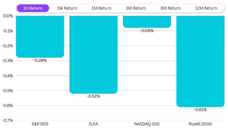 In the US, markets were slightly down overnight — S&P 500 slipped 0.28%, Dow Jones fell 0.52%, and Russell 2000 lost 0.61%.