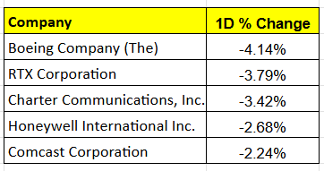 Stocks like Boeing, Charter, RTX, Honeywell, and Comcast were among the bigger losers, down 2–4%. Some of these major names seem to be in a distribution phase on the charts, which may indicate near-term weakness.