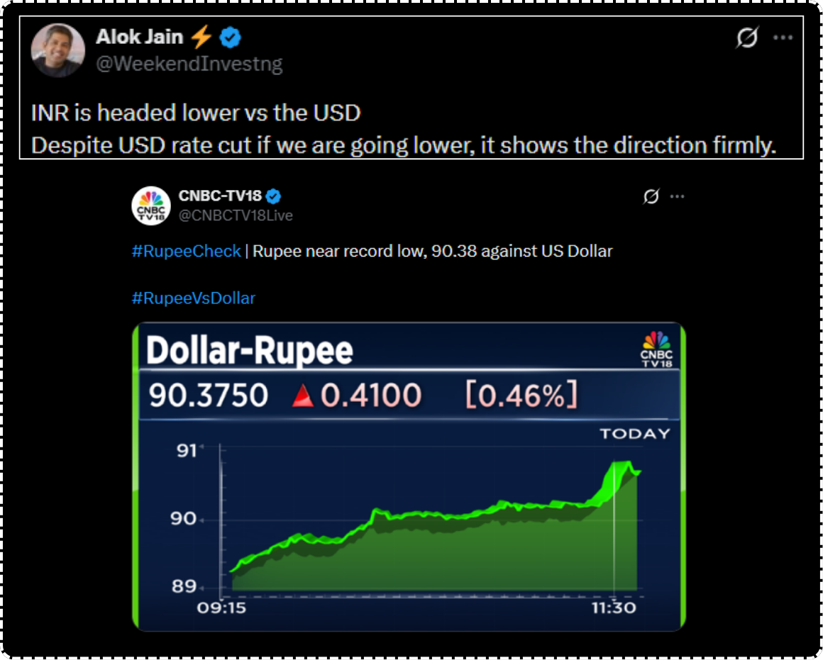 Today, we saw a small bounce in the market following the US Federal Reserve rate cut meeting. The general sentiment across Asian markets was mixed, with indices both up and down. A key factor influencing the domestic market is the continued weakening of the currency, with the USD INR hitting a new high of 90.37 against the US dollar, which means the rupee has depreciated to a new low.