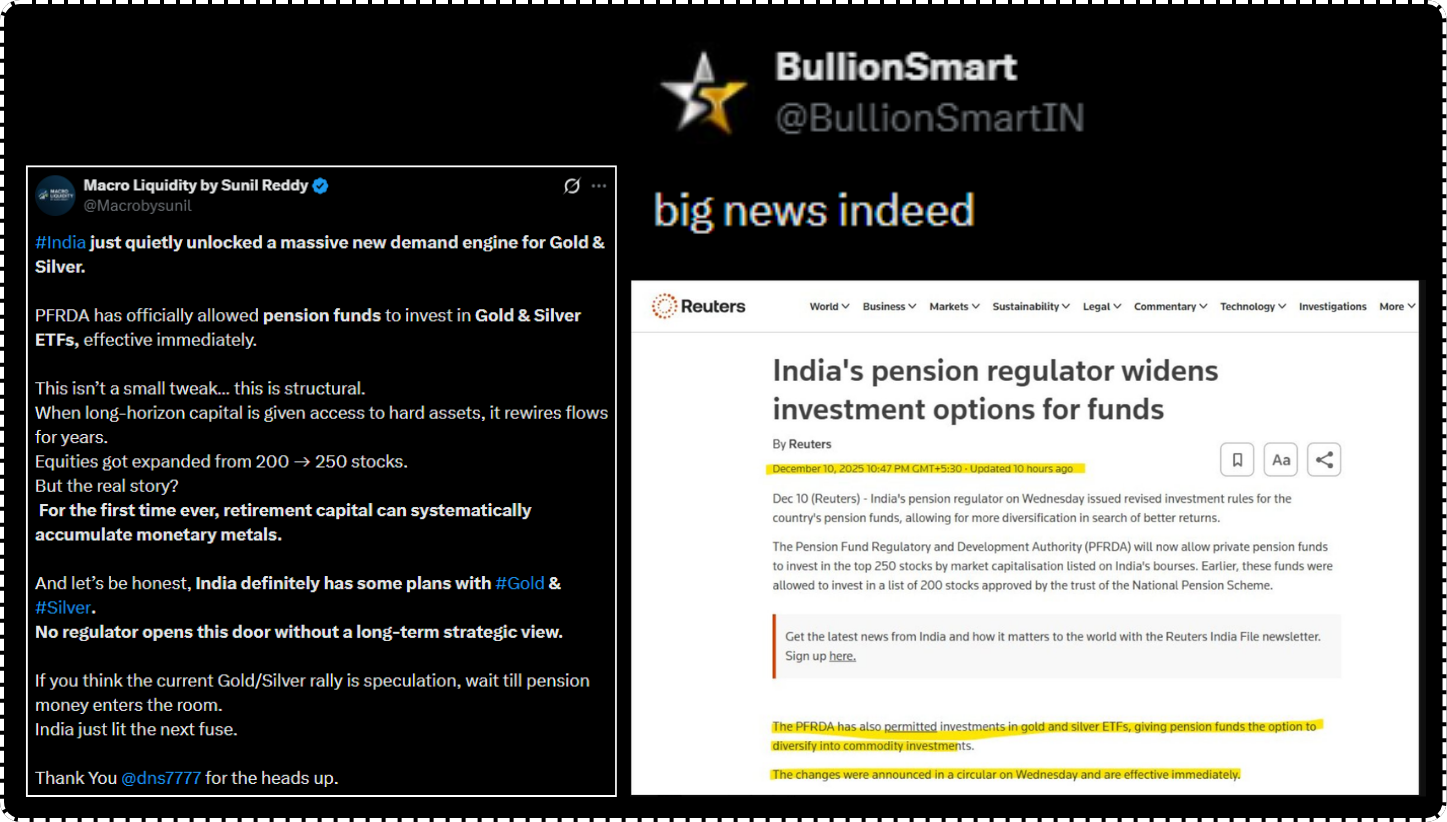 A very interesting development shared in the Tweet of the Day segment, originally highlighted by Sunil Reddy, pointed to a change in the Indian pension regulator’s investment thesis. The PFRDA has permitted investments in gold and silver ETFs, marking possibly the first time that pension funds are being allowed to invest a portion of their corpus into commodities.