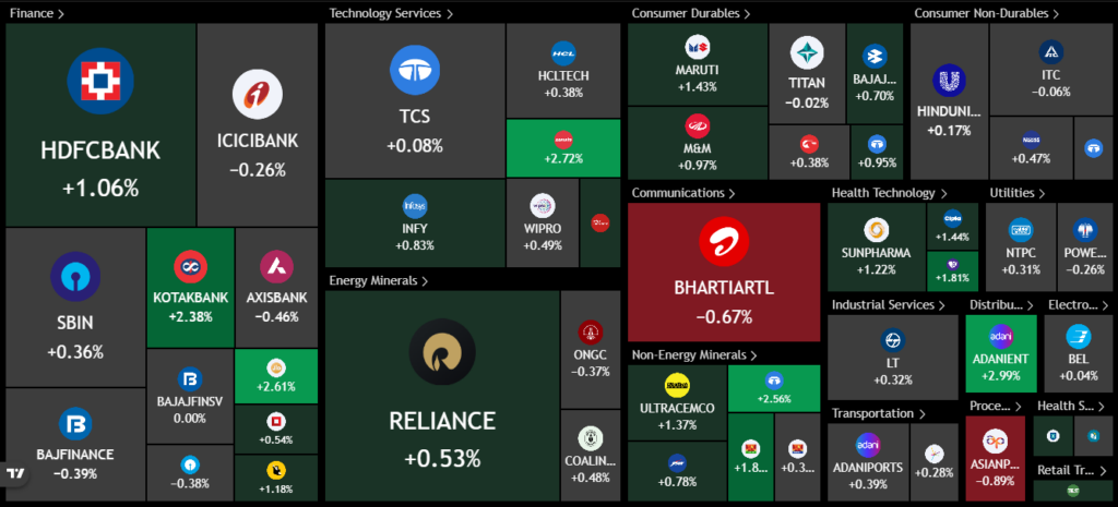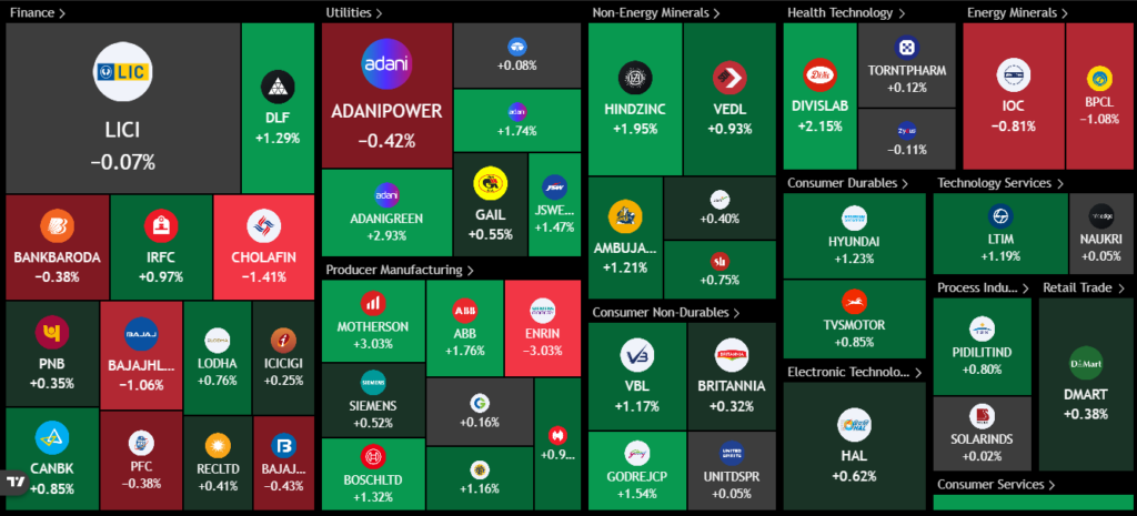 The Nifty Next 50 heatmap was also predominantly positive, with minor losses in IOC, BPCL, Chola Finance, Enrin, and Bajaj Holding. Good gains were observed in Hindustan Zinc, Vedanta, Divi’s Lab, Adani Green, Motherson Sumi Systems, and Bosch.
