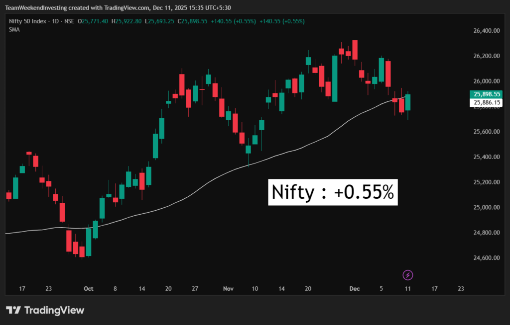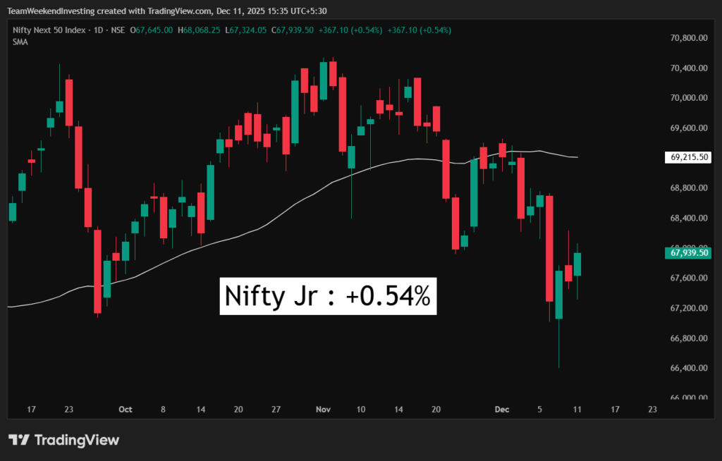 Market indices showed a strong rebound, with the Nifty up 0.55% and Nifty Junior gaining 0.50%, placing the Nifty Junior very near the 25,900 level again.