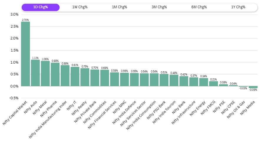 Sectoral trends showed that most sectors gained. Nifty Media and Oil and Gas were the only two that were slightly in the red. The Capital Markets sector came back very strongly, posting a 2.7% gain. When the Capital Market sector leads either up or down, it typically signals a strong move in that direction. Autos also moved up 1.1%, while Metals and Pharma gained nearly 1% each, making it a decent day for the market overall.
