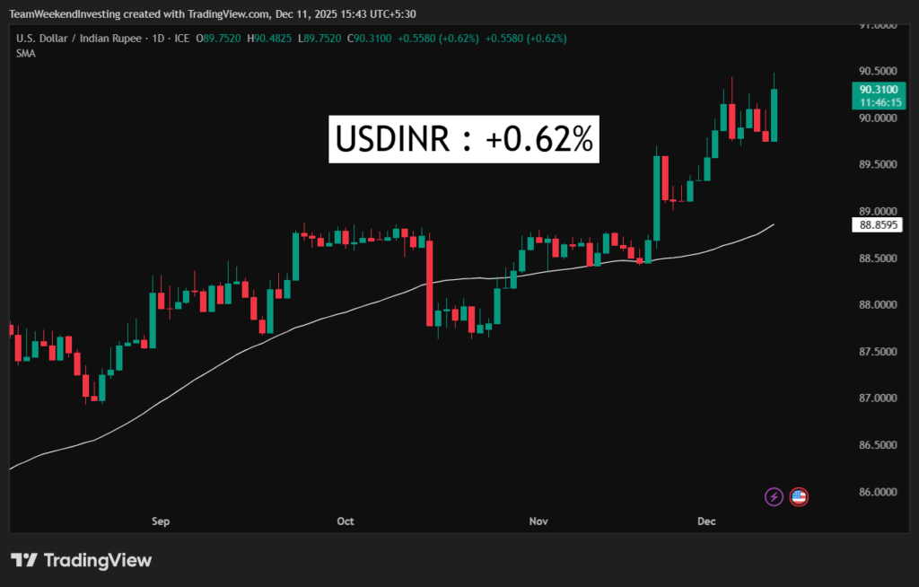 As mentioned, the USD INR closed at 90.31, up 0.62%, which is not good news for the rupee.