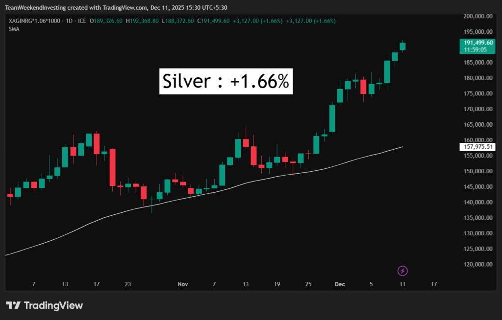 Silver continues to make newer and newer highs, now priced at 1,91,500 per kilo. This is a huge and ferocious run, climbing from 1,50,000 in the third week of November to 1,91,000 in the second week of December. This rapid surge in silver is likely a reflection of a short silver market in terms of delivery and how far silver prices had lagged behind other asset classes like gold and equities. The monumental breakout happened near the $50 mark on the dollar chart. While the move looks stretched, silver rallies can last for many years, though they are often followed by dramatic collapses. Consequently, silver is considered a very risky and dangerous metal to trade, with longer-term investors generally finding gold a safer alternative.