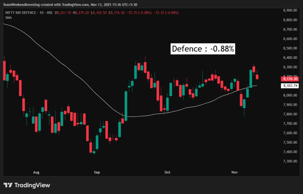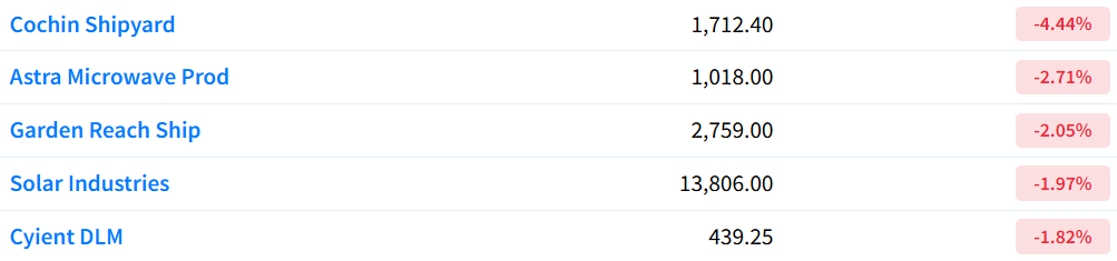 Defense stocks, which had been moving very strongly for the last three or four sessions, are now correcting. Specific stocks like Cochin Shipyard fell 4% after its results, and Astra Microwave, Garden Reach Shipping, Solar Industries, and Cyient also lost ground.