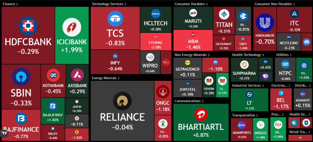 This was a complete reversal of the market’s internal makeup during the day, which the Nifty Heat Map clearly illustrates. Many stocks were in the green this morning, but by the end, names like Hindalco, TCS, ONGC, Shriram Finance, Bajaj Finance, ITC, BEL, and HDFC all lost ground.