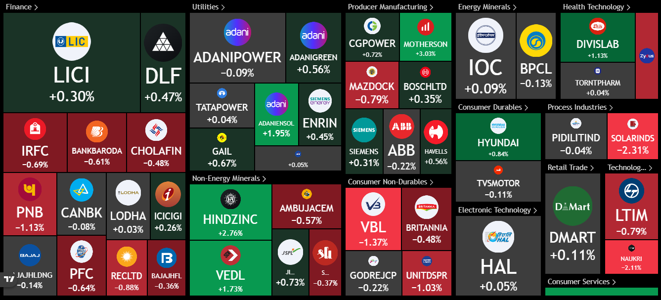In the Nifty Next 50 space, commodities were leading, with Vedanta and Hindustan Zinc both up. Other stocks that performed well included Motherson, Adani, Hyundai, and Divi’s Lab, alongside gains in DLF and LIC. Losers in this segment included Varun Beverages, Mazdock, Solar Industries, PNB, REC, United Spirits, and Naukri.