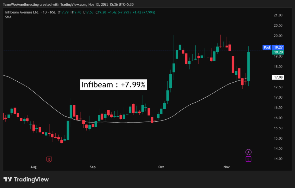 In the Mover of the Day segment, Infibeam shares jumped 8% after its profit surged 51% and revenues hit record highs, with the stock moving 8% higher from its previous levels. The chart shows a huge preceding move that was consolidating, and now the resumption of the upward trend seems to have begun.