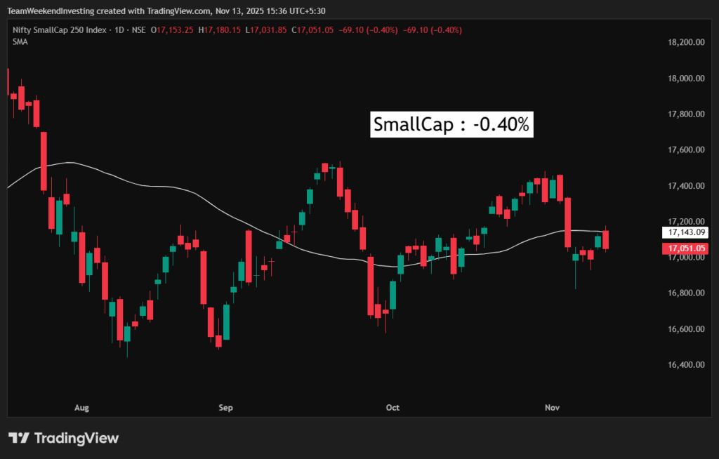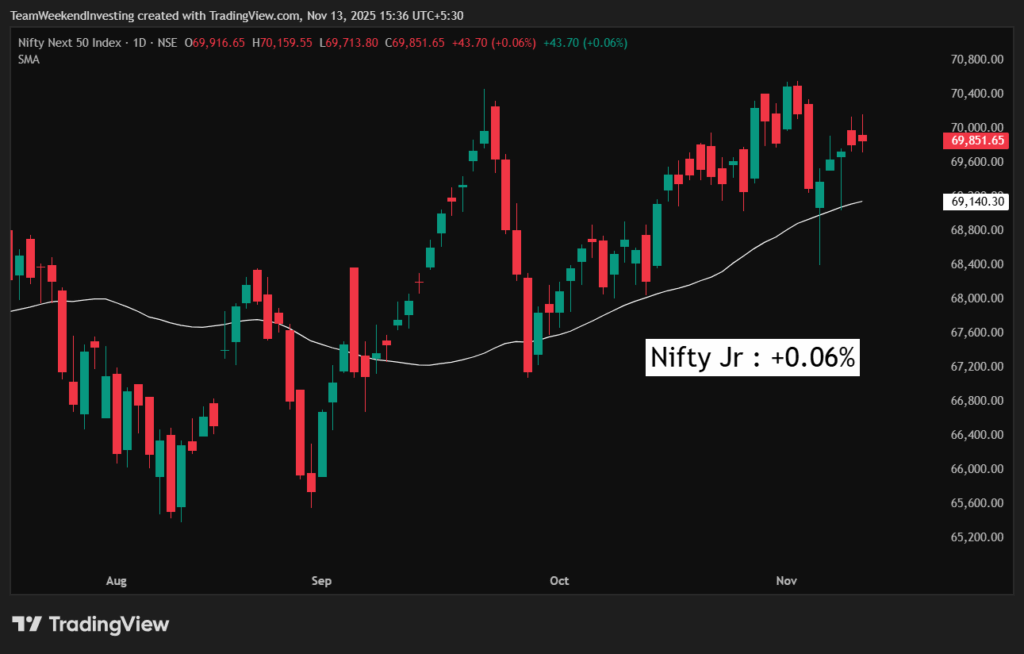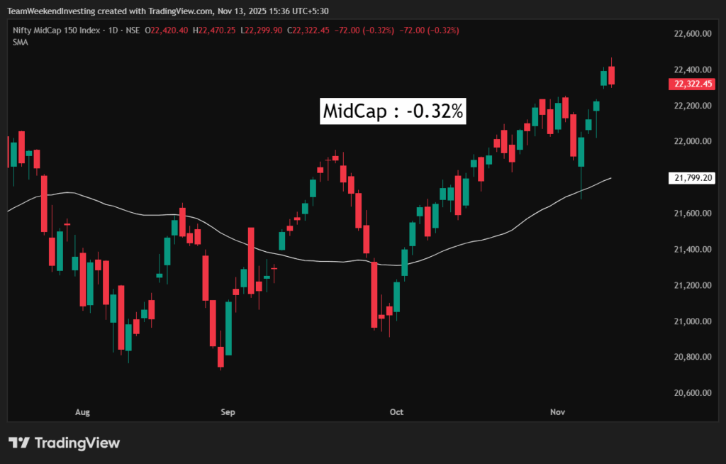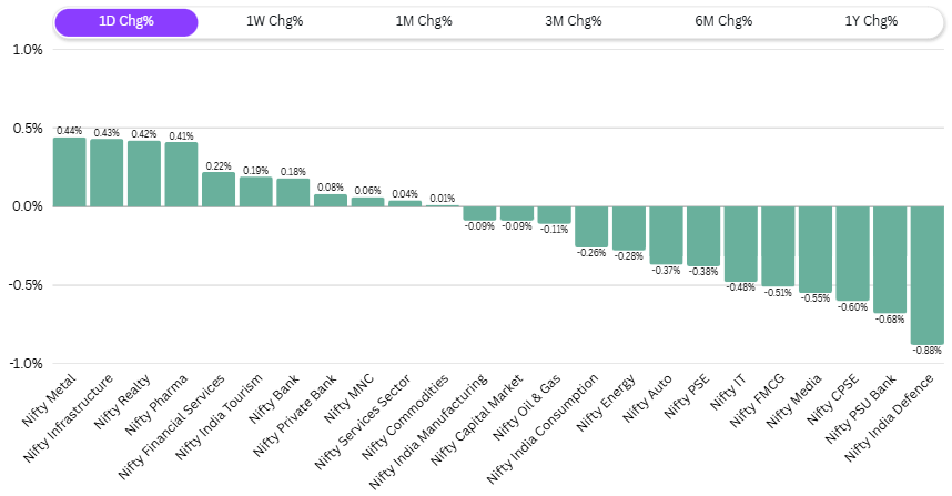 Looking at sectoral trends, there was no sector with even a half a percent gain in the highest-gaining category, with Metals, Real Estate, Infrastructure, and Pharma all up 0.4%. On the downside, Media lost 0.55%, CPSEs were down 0.6%, PSU Banks fell 0.7%, and India Defense was down 0.8%, showing significant down moves in some of these sectors.
