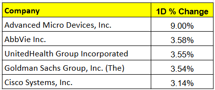 Some of the notable gainers yesterday included AMD, which was up 9%, bouncing back strongly after dropping just a few days ago. Other gainers were AbbVie Inc. up 3.5%, UnitedHealth, Goldman Sachs, and Cisco, with Cisco rising 3% for the day.