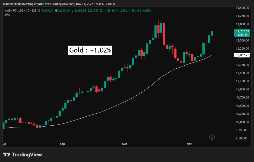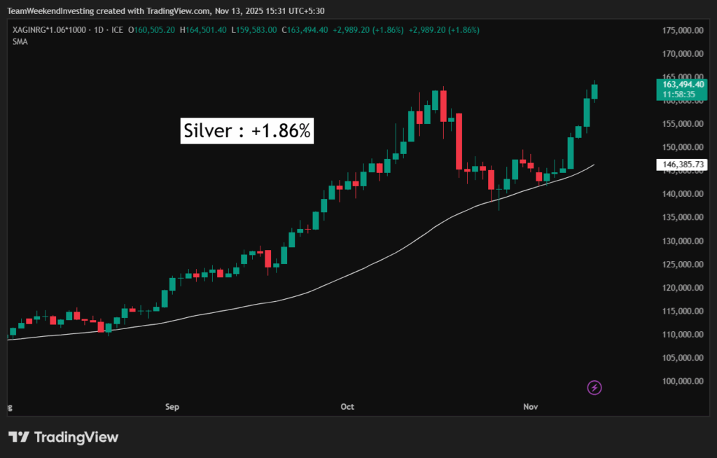 Silver is up even more significantly, at 1.86%. The daily chart for silver in rupee terms shows it has actually surpassed its previous high.
