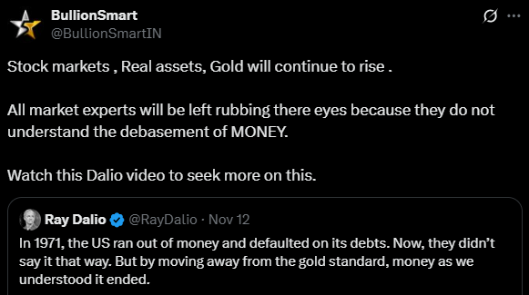 The Tweet of the Day focuses on Ray Dalio, who has been very vocal about money debasement—the continuous printing of money out of thin air without any backing. Dalio nicely explains that every few decades, governments engage in reckless overspending to fulfill entitlements, which necessitates continuously printing money. This continuous money printing causes money debasement, leading other asset classes to rise as the value of money crashes.