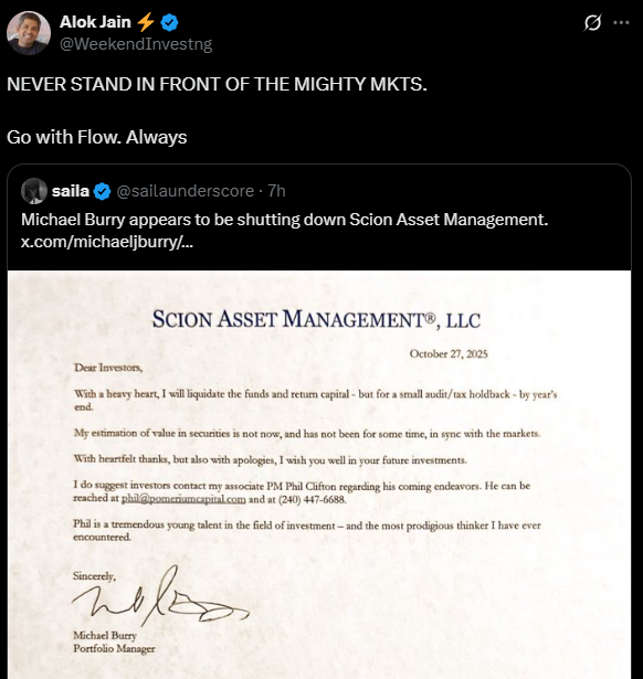 On a separate note, Michael Burry, the “Big Short” guy famous for shorting markets, appears to be shutting down his asset management company, although this is speculative and it is unclear if the money is moving to another AMC or being returned. In a letter, he mentions liquidating the fund and returning capital “with a heavy heart,” suggesting things may have gone sour.