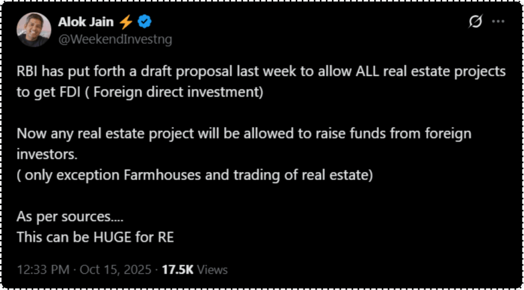 Coming back to real estate, the RBI has reportedly proposed a draft that allows all real estate projects to receive foreign direct investment. Any project could raise funds from foreign investors, except for a few exceptions. Though this is based on source news, if it turns out to be true, it could be a game changer for the sector.