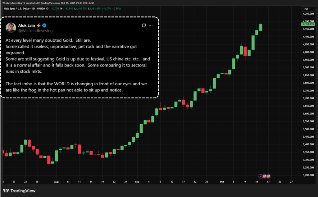 Even though gold is up 60% in the past year, very few people actually own it. That tells you how long this trend might last. Some think gold is rising only because of the festive season or the US-China tension, but this seems like a much deeper change. Some people are even comparing gold’s rally to sectoral runs — like defense or chemical stocks — assuming it will fall again. But that thinking may be misplaced. The world is changing right before our eyes. It’s like the frog in boiling water that doesn’t realize the temperature is rising until it’s too late. This may be a once-in-a-lifetime kind of situation. We could be living through a time that history will remember as the turning point between 2022 and 2025 when the world order began to shift.