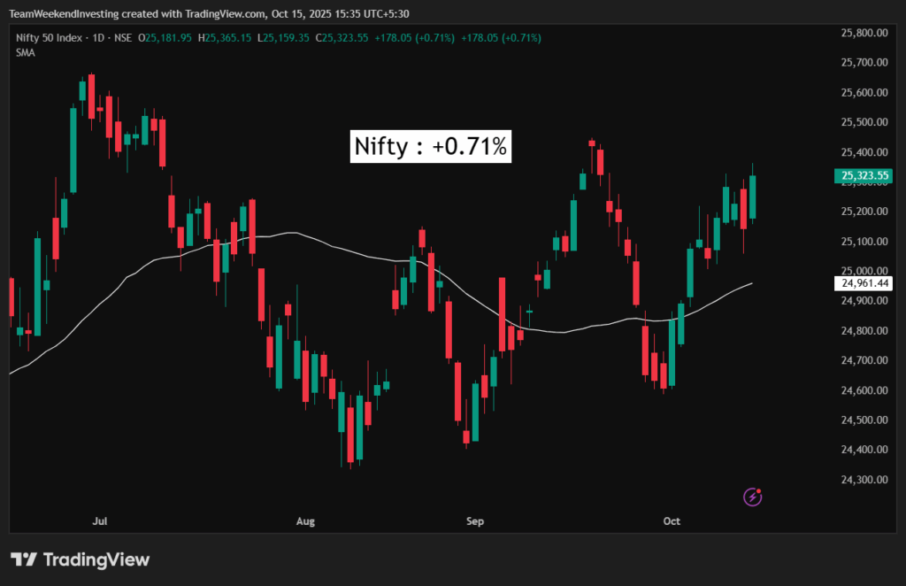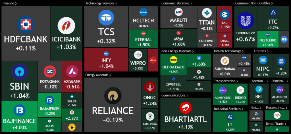 The Nifty screen was largely green, with stocks like L&T, Indigo, Bajaj twins, ICICI General, and Nestle doing very well. Bharti Airtel also performed strongly.