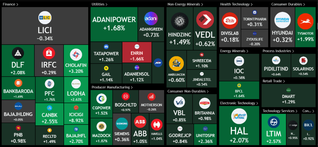 Nifty Next 50 showed a superb run, with ICICI General Insurance up 9% on earnings surprise, making it the big mover of the day. Among other gainers were Canara Bank, Bajaj Housing, Cholamandalam, Bank of Baroda, DLF, Adani Ports, LTIM, and HAL. It seems a new leg in the market may have started today, which could last for several days or even weeks.