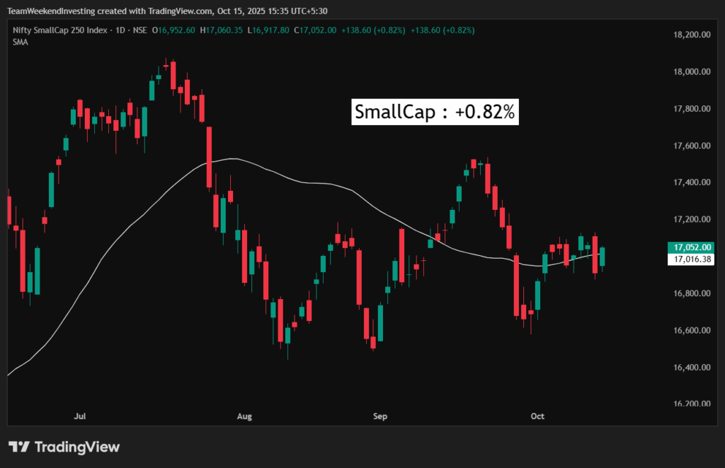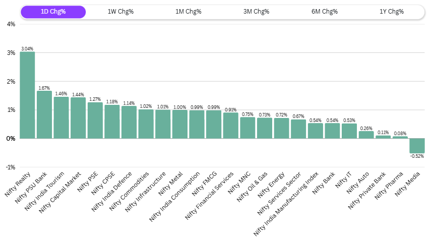 Sector-wise, media was the only sector that ended lower. The biggest mover was the real estate index, up 3.04%, followed by PSU banks at 1.6%, tourism at 1.4%, capital markets at 1.4%, public sector enterprises at 1.2%, and CPSE at 1.18%. Real estate, which is up 4.5% in the past week, has started to recover after a weak phase. Over the past month, it was up only 1%, and over the last year, it is still down 15%. This could be the beginning of a new rotation towards the real estate sector.