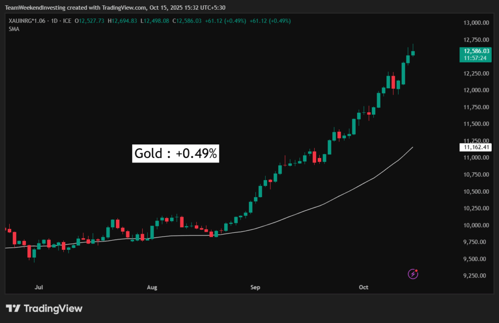 Gold continued its strong rally, up 0.49% today, even after a morning correction. The converted official price stood at ₹1,25,860 per 10 grams. However, you can’t buy gold at this price in the market because premiums are running very high. Silver is just not available anywhere.