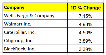 Tech and large-cap stocks are more subdued, while smaller companies are catching up. Among the top performers were Wells Fargo, Walmart, Caterpillar, Citigroup, and BlackRock.