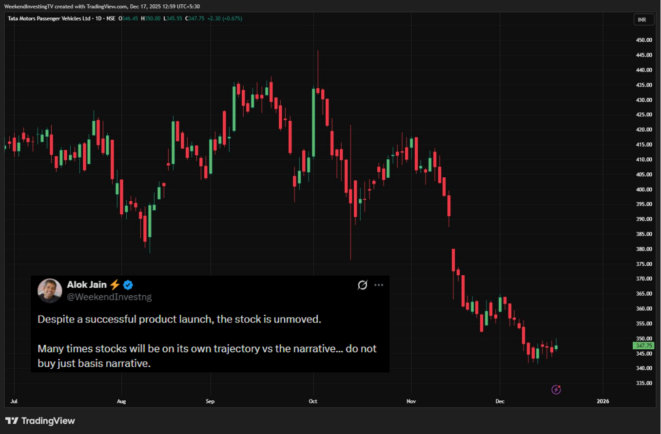 The day’s insights conclude with a lesson on market narratives, using Tata Motors as an example. Despite an exceptional launch of a new SUV with 70,000 bookings on day one, the stock price barely moved, gaining only 0.6%. This highlights how stocks can move very differently from the popular story surrounding them. Buying or selling based solely on a narrative can be dangerous, as many other factors influence price.