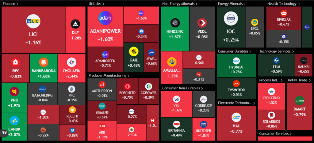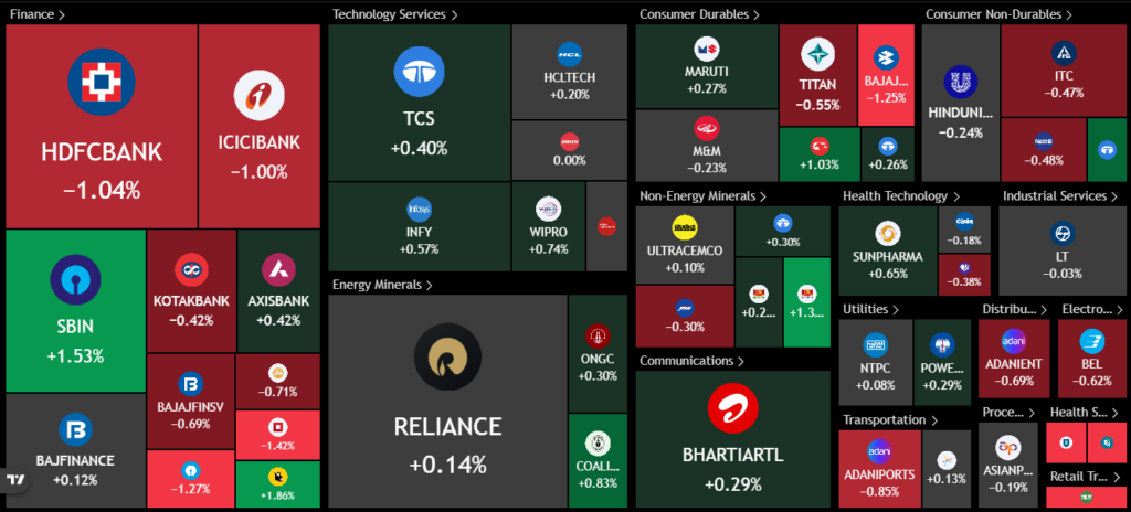 The heat map showed significant pressure on private banks, with HDFC Bank, ICICI Bank, and Kotak Bank all trading lower. However, State Bank of India, Shriram Finance, Coal India, and Hindalco saw some gains. IT stocks and Reliance remained flattish, while Bajaj Auto and Adani Ports were among the notable losers.
