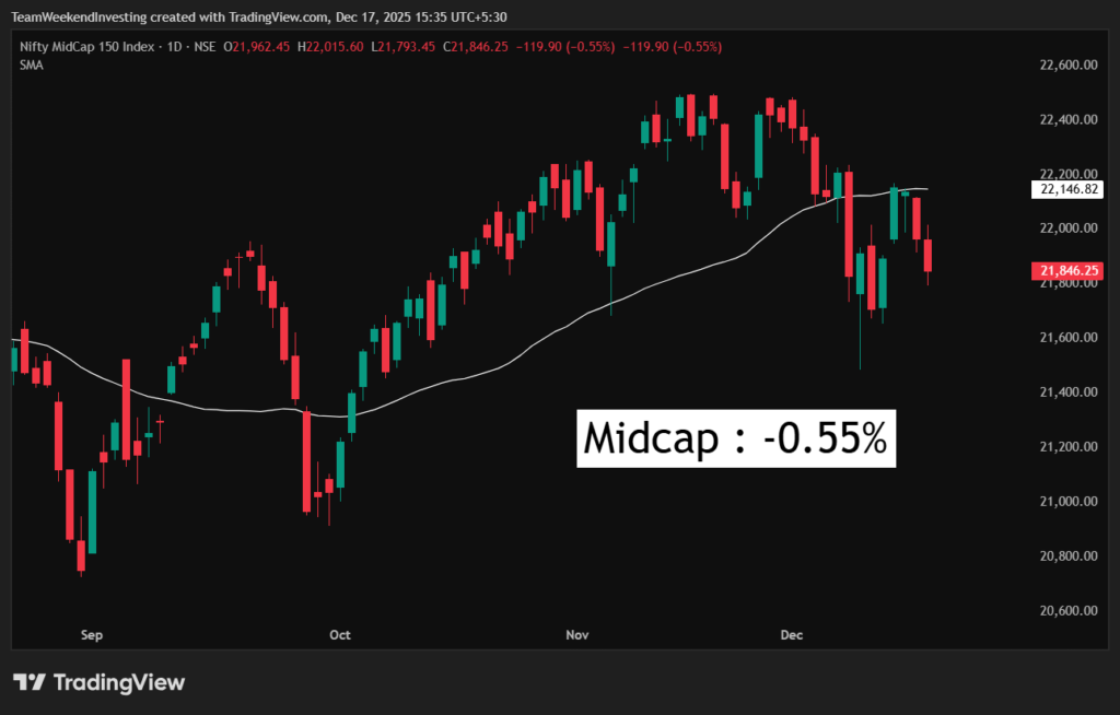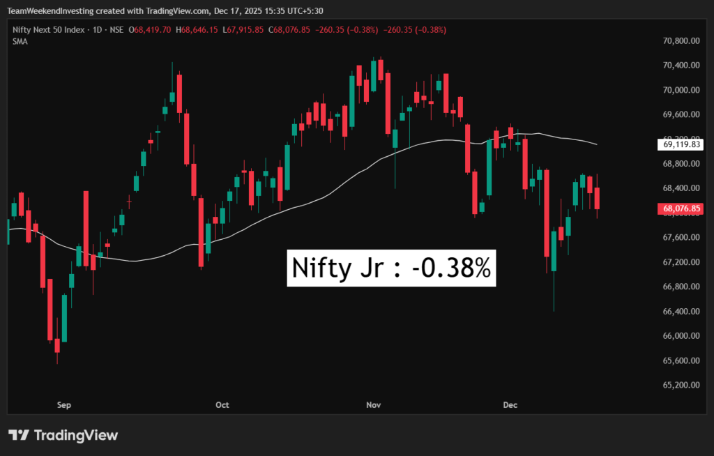 Nifty Junior fell by 0.38%, while Mid-caps dropped 0.55%, erasing a significant portion of recent gains.