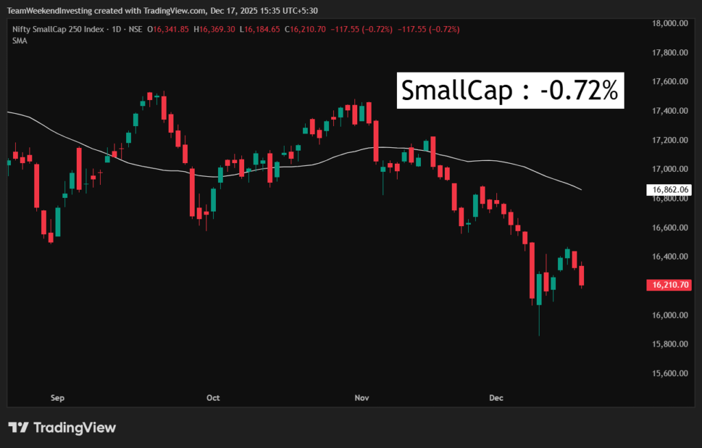 From a technical perspective, a head and shoulders pattern appears to be forming in the mid-cap segment, which could signal further weakness. Small caps also resumed their downward trajectory, failing to break through existing resistance levels and confirming a short-term bearish trend.
