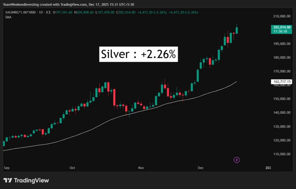 In the commodities space, gold saw a marginal dip of 0.31% to 13,288. In contrast, silver continues its relentless daily climb. Over the last two months, silver has moved from 1,40,000 to 2,02,000 per kilogram, driven by a global surge in demand and a significant shortage in supply.