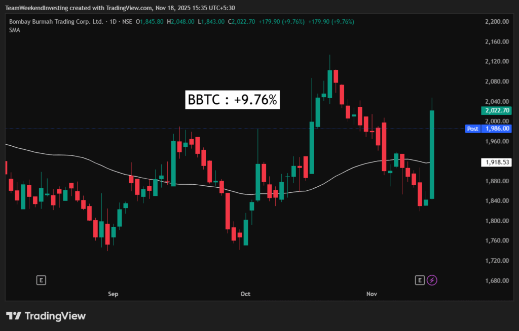 The Mover of the Day was Bombay Burma Trading Company (BBTC), which surged 10% following the company’s announcement that it had terminated an agreement with MSTC for the e-auction of immovable properties.