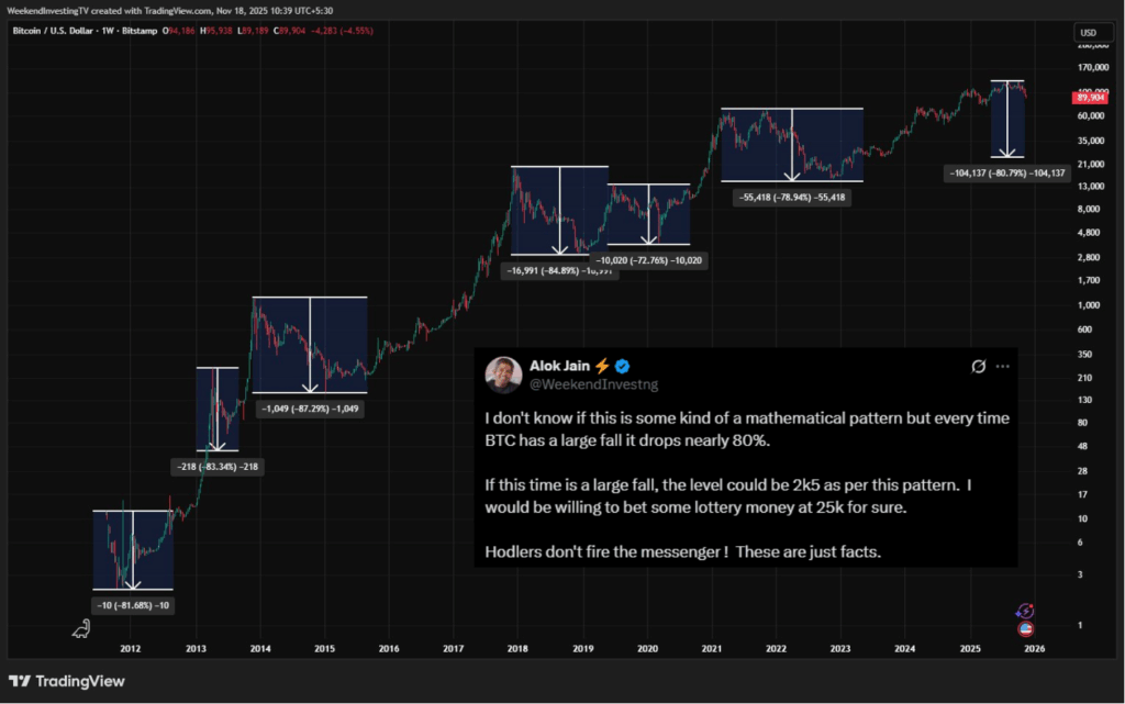 The Tweet of the Day showed the historical chart of Bitcoin over the last 13 or 14 years. It interestingly revealed a pattern where every substantial drop in Bitcoin’s price has been around 80% to 85% (e.g., 81% in 2012, 83% in 2013, 87% in 2015, and other drawdowns of 73%, 79%, and 81%).