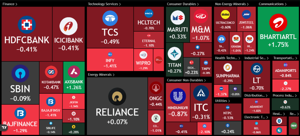Almost nothing was spared today, including IT stocks, FMCG stocks, steel and cement, infrastructure stocks, and banking and finance. The only exceptions that gained were Axis Bank and Bharti Airtel, with Bharti Airtel making new highs even in this tough market environment. Reliance was flat.
