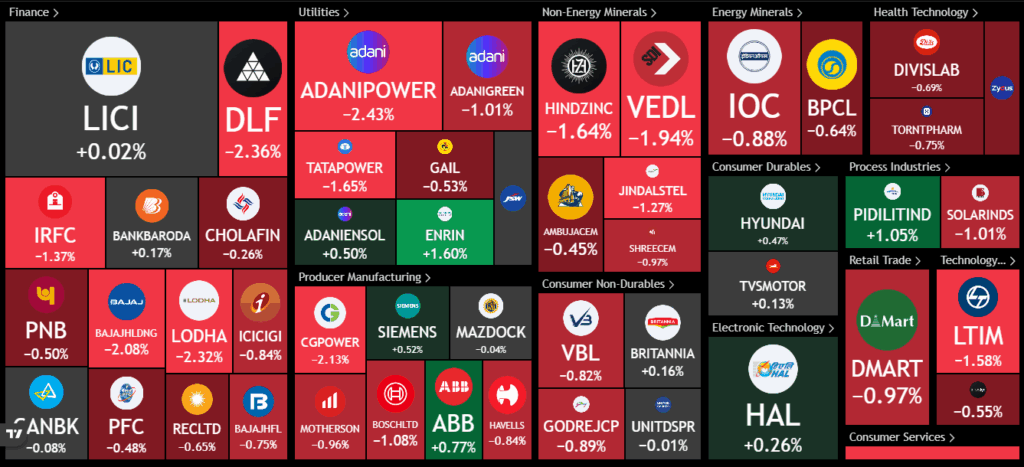 In the Nifty Next 50 space, there was a lot of red, with Adani stocks, DLF, Lodha, Hindustan Zinc, Jindal Steel, and LTIM all down. However, there were some greens in Enrin, ABB, and Pidilite, along with HAL and Hyundai.