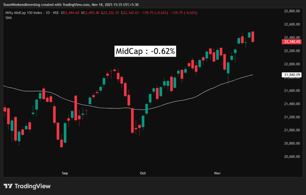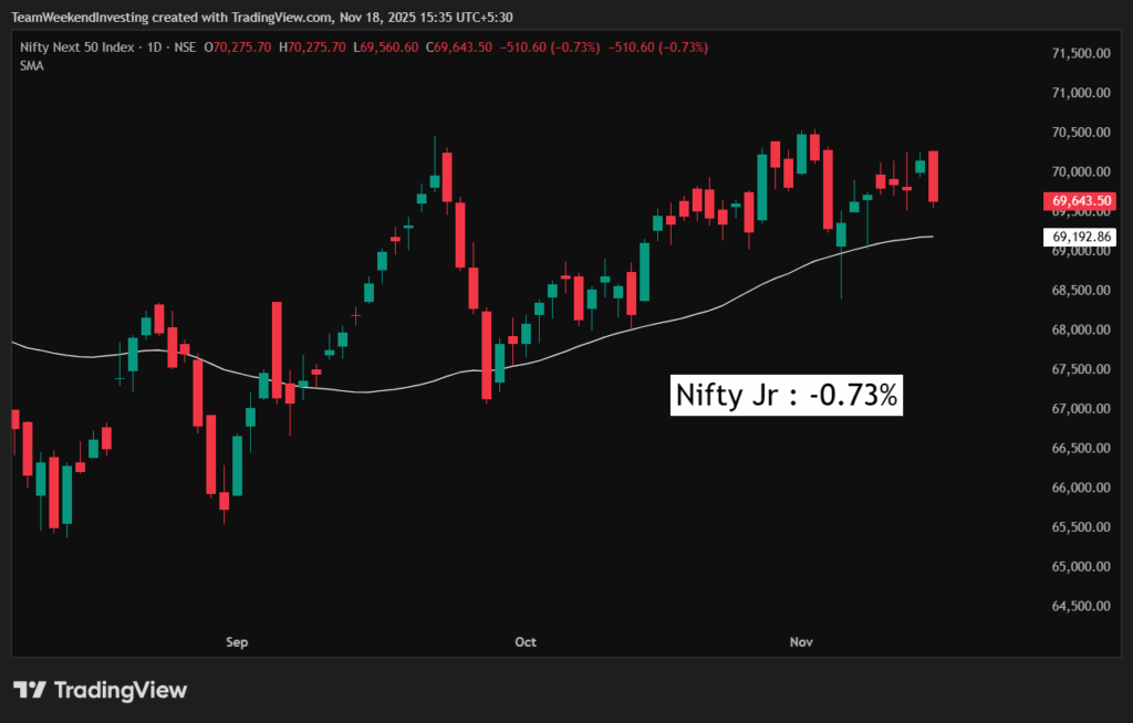 However, the Nifty Junior saw a much steeper cut at 0.73%, losing what it had gained over the last five sessions.