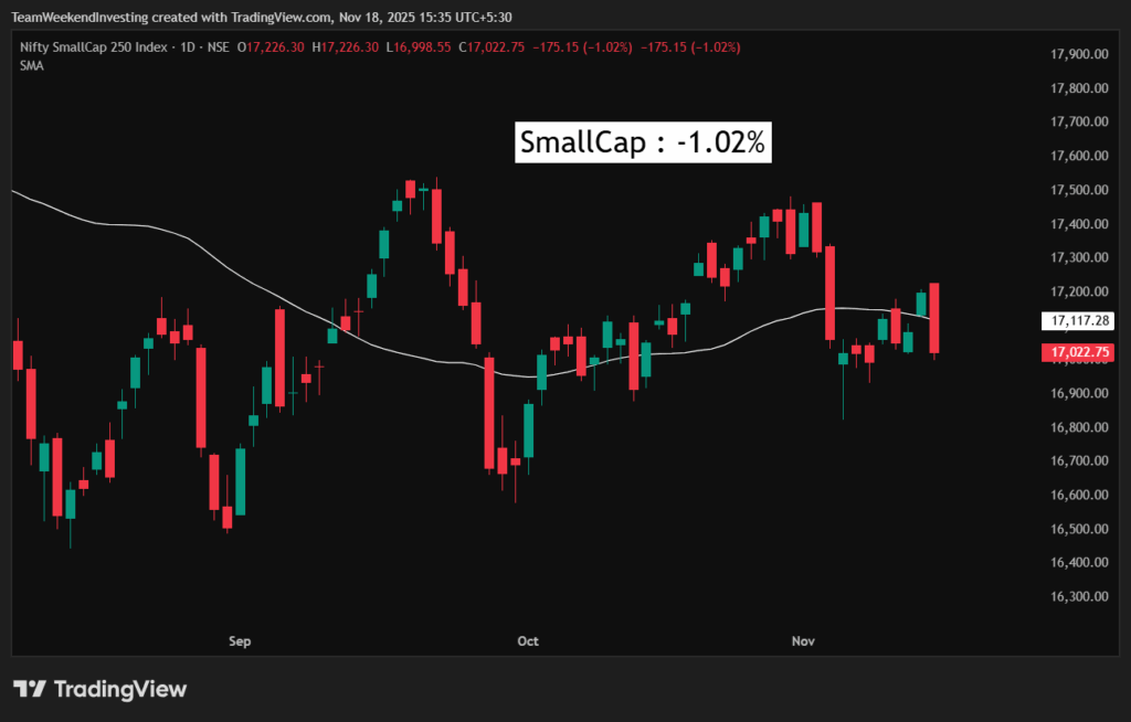 Midcaps were also down 0.62%, losing yesterday’s gains and the gap-up opening. Small caps experienced a bigger fall of minus 1.02%, giving up about four or five days of gain.