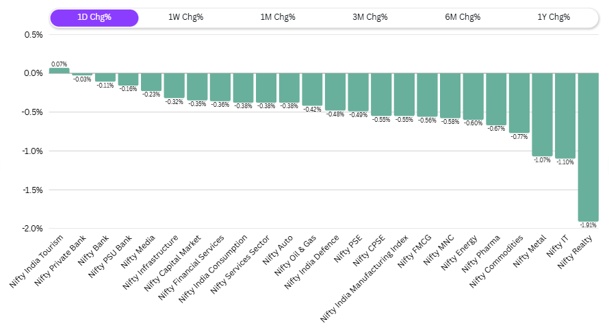 In sectoral trends, it was almost a mirror image of yesterday, with all sectors down. Real Estate moved down the hardest at 1.9%. Nifty IT was down 1.1%, Metals down 1%, and Commodities and Pharma also lost ground at 0.7% and 0.6%, respectively, marking a rough day for gains. Over the last one month, the only sectors that have shown good gains are PSU banks at nearly 11% and Oil & Gas stocks at nearly 6%; the rest are all marginal.