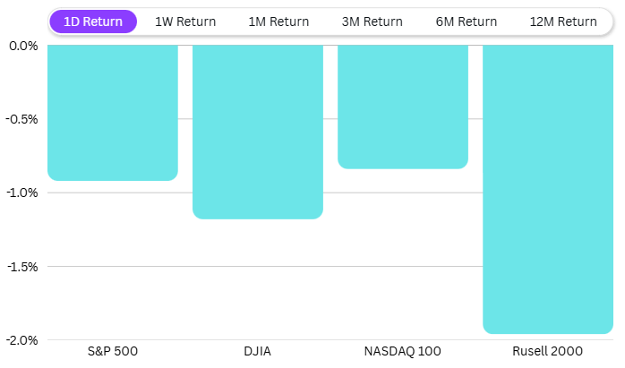 In the previous session, US markets were weak. The S&P 500 was 1% down, the Dow Jones 1.2% down, and the Nasdaq nearly 0.9% down. The Russell 2000 was hit very hard, down 2%, which is not a common occurrence.
