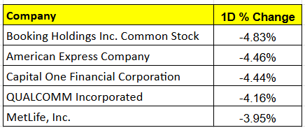 Some of the stocks leading the down moves were Booking Holdings Inc. (4.8%), American Express (4.4%), Capital One, Qualcomm, and MetLife (all down between 3% and 4%). Some of these stocks could potentially be in the Weekend Investing U.S. portfolio, and the standard disclaimer applies.
