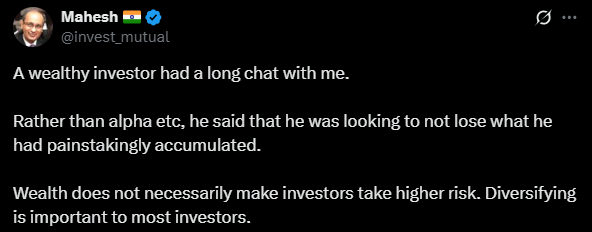 Another tweet, from Invest Mutual, relayed a conversation with a wealthy investor who said that instead of looking for Alpha (market-beating returns), he was focused on preserving the wealth he had painstakingly accumulated. This confirms that for many wealthy individuals (HNIs), wealth does not equate to taking higher risks; their priority is not to lose what they have built. Diversifying is most important to them.