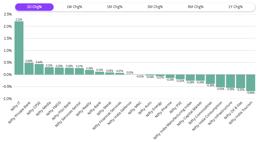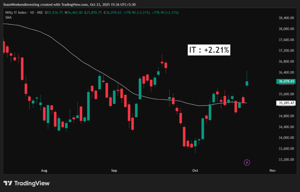 Sectorally, there wasn’t much action. Tourism was down 0.6%, oil and gas fell 0.5%, and infrastructure slipped 0.5% as well. The only notable gainer was IT, up 2.2%, with private banks inching up 0.49%. Infosys, HCL Tech, TCS, and Wipro performed well as the sector closed some gaps on the charts, which often act as magnets for prices.