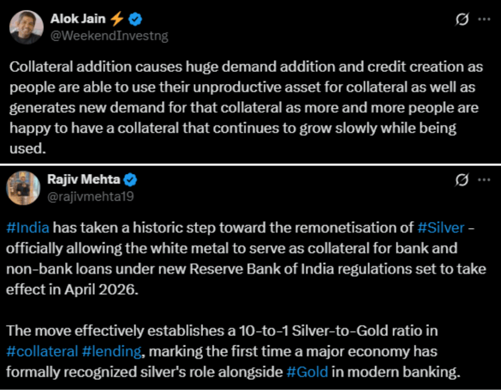 One major piece of news came from the Reserve Bank of India, which announced that from April 2026, silver will be allowed as collateral for loans from banks and non-bank institutions. This has created a buzz in financial circles, as it adds a new productive use for precious metals held by citizens.