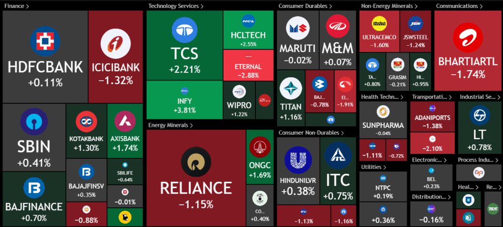 The heat map was largely red, led by a drop in heavyweights like Reliance, which is now facing margin pressure as it turns away from Russian oil. Bharti Airtel, UltraTech Cement, JSW Steel, and Bajaj Auto also fell.