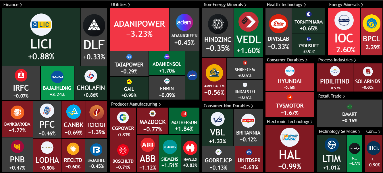 On the brighter side, TCS, Infosys, and HCL Tech gained on renewed optimism about the Indo-US friendship. Axis Bank and ONGC saw minor gains, while ICICI Bank continued its downward trend following poor quarterly results. In the Nifty Next 50, Adani Power dragged the index down, joined by names like TVS Motors, IOC, HAL, and Canara Bank.