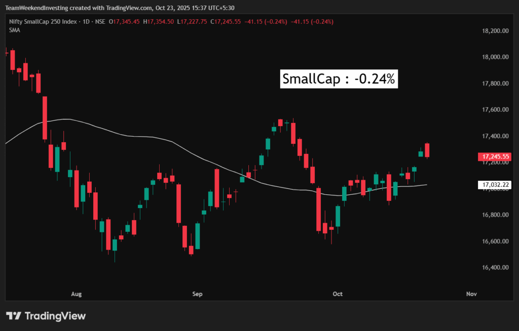 Midcaps and smallcaps also lost ground, down 0.15% and 0.24% respectively, while the Nifty Bank managed only a modest gain of 0.12%.