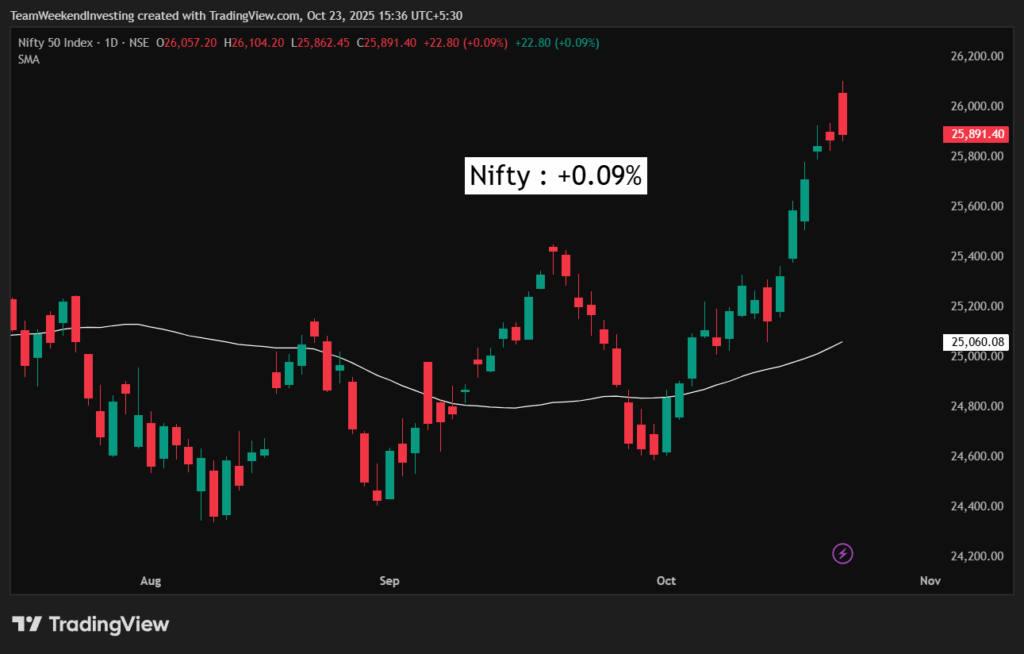 Looking at the charts, the Nifty opened strong at 26,104 but closed nearly 250 points lower from the top, erasing all intraday gains to end almost flat at just -0.09%. The rally seemed stretched, which likely explained why the market couldn’t sustain higher levels.